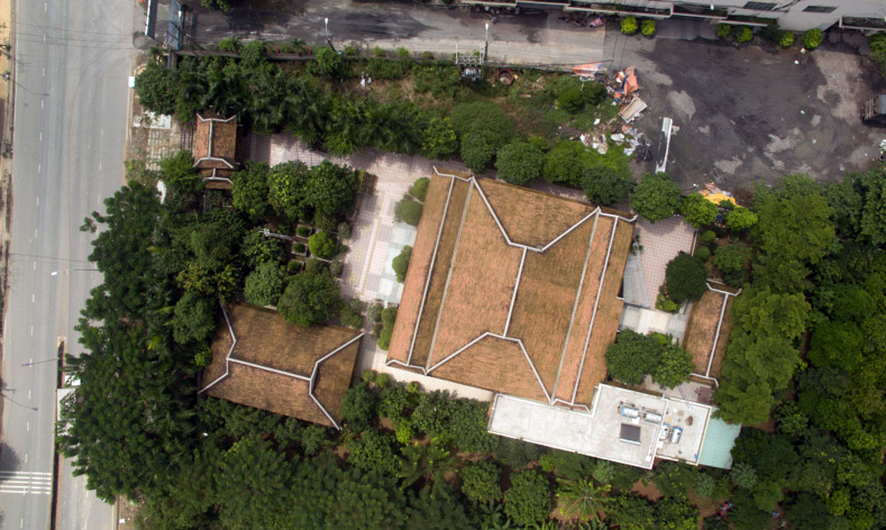 Nhìn từ trên cao, phía trong khu đất này có 1 ngôi nhà chính lớn, mái ngói, kiến trúc độc đáo và xung quanh hệ thống nhà nhỏ cùng vườn cây khép kín.