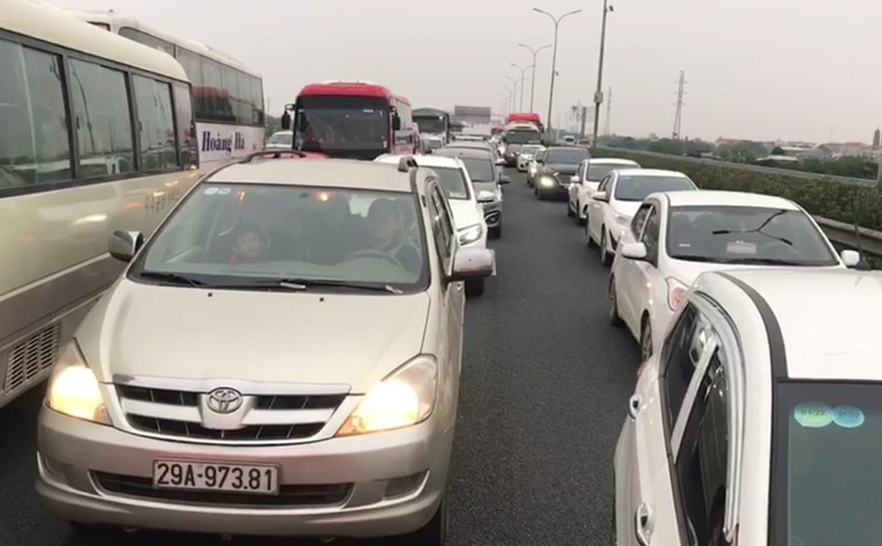 Giao thông trên cao tốc Pháp Vân – Cầu Giẽ ùn ứ kéo dài, CSGT yêu cầu trạm thu phí xả trạm. Ảnh: HẢI MINH