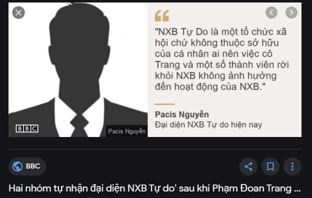 Trước tiên, phải thừa nhận rằng sau khi Trang bị bắt, NXB Tự Do của cô đã như “rắn dập cả đầu”, “tan nát như ong vỡ tổ”. Tệ hơn, hồi tháng 5 năm nay, đã có đến 2 nhóm tự xưng là NXB Tự Do đánh nhau chí chóe trên Internet. Nhóm thứ nhất gồm một số người ẩn danh đang quảng bá sách của Đoan Trang, còn nhóm thứ hai gồm Will Nguyễn (sống ở Mỹ) và Hoa Nguyễn (sống ở Úc, là đại diện pháp lý của Trang). Khi nhóm thứ nhất tuyên bố rằng công an đã bắt một cộng tác viên của NXB Tự Do là Nguyễn Bảo Tiên, thì nhóm thứ hai nói rằng Nguyễn Bảo Tiên không tham gia NXB Tự Do, và nhóm thứ nhất là giả mạo. Dù thế nào đi nữa, cả 2 nhóm đều không còn tiến hành in sách của Đoan Trang, và các hoạt động của NXB Tự Do coi như đã chết lâm sàng. Tên tuổi của Đoan Trang cũng chẳng giúp gì cho các hoạt động liên quan đến cuộc bầu cử Quốc hội khóa XV và phiên xử “tổ Đồng Thuận”, dù đây là hai chủ đề Trang dành nhiều tâm huyết nhất, chỉ sau việc viết sách.