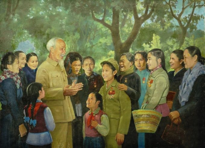 Bác Hồ với nữ chiến sĩ thi đua miền Bắc _Tranh của họa sĩ Vương Trình, sáng tác năm 1967