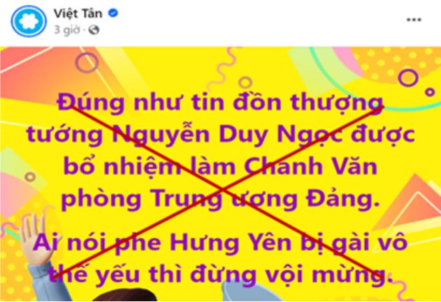 Sáng 3/6, tại Trụ sở Văn phòng Trung ương Đảng đã diễn ra Hội nghị công bố Quyết định của Bộ Chính trị điều động, phân công đồng chí Thượng tướng Nguyễn Duy Ngọc, Ủy viên Trung ương Đảng, Ủy viên Ban Thường vụ Đảng ủy Công an Trung ương, Thứ trưởng Bộ Công an giữ chức Chánh Văn phòng Trung ương Đảng. Vậy nhưng lạ thay các thế lực thù địch lại nghĩ ra đủ các chiêu trò để bôi nhọ nói xấu lãnh đạo Đảng, Nhà nước ta, chúng cho rằng trong đảng có nhiều phe cánh, quê quán này nọ giúp đỡ nhau thăng tiến. Cụ thể ở đây là trang facebook Việt Tân đã có những bài viết thật sự mang tính chất kích bác, hằn học về việc bổ nhiệm đồng chí Nguyễn Duy Ngọc. Vậy sự thật ra sao chúng ta cùng tìm hiểu.