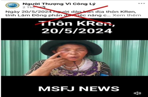 Trên trang mạng Facebook Người Thượng Vì Công Lý vừa qua có đăng tải bài viết, đoạn video về sự việc diễn ra vào ngày 20/5/2025 ở thôn K’rèn, xã Hiệp An, huyện Đức Trọng, tỉnh Lâm Đồng, với những nội dung xuyên tạc là “người dân tộc K’Ho ở thôn K’Rèn, xã Hiệp An, huyện Đức Trọng, tỉnh Lâm Đồng bị chính quyền cướp đất”. Đây là sự đổi trắng thay đen, bóp méo sự thật một cách trắng trợn, xúi giục người dân chống phá chính quyền dưới cái mác vì “dân chủ”, “nhân quyền”; mưu đồ ích lợi cá nhân, bôi nhọ Đảng và chính quyền của ta, thể hiện bản chất đê hèn của tổ chức “Người Thượng Vì Công Lý”.