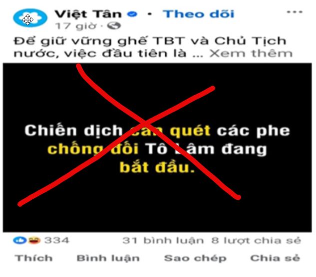 Cụ thể ngày 04 tháng 8, trên trang Facebook “Việt Tân” có bài viết bóp méo, xuyên tạc trắng trợn của Việt Tân đối với công cuộc xây dựng chỉnh đốn đảng và cuộc đấu tranh phòng, chống tham nhũng của đảng ta; nhằm mục đích lèo lái dưu luận hiểu sai, bôi nhọ hình ảnh lãnh đạo đảng và nhà nước ta.